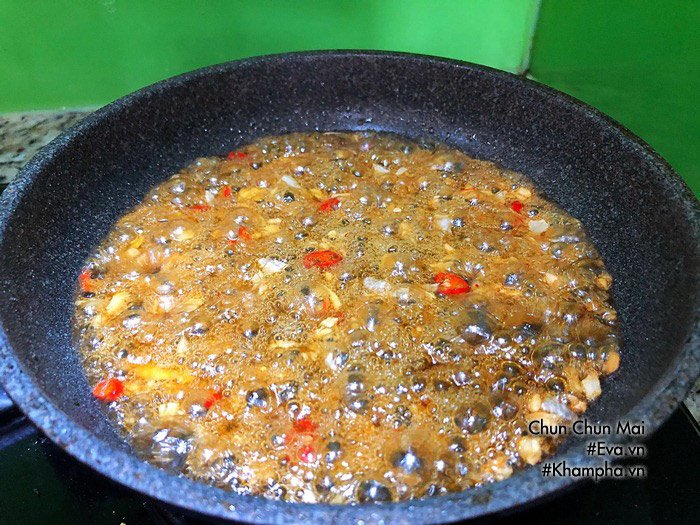 Bắc chảo lên bếp, chảo khô cho hỗn hợp nước mắm me ở trên vào đun cho hơi sệt lại chút, nêm nếm vừa ăn thì cho tỏi, gừng, ớt ở trên vào, trộn đều và tắt bếp.