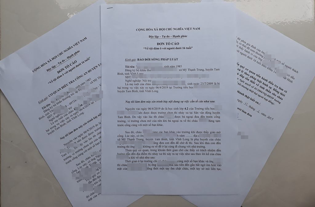 Ngày 14/4, chị V.T.M.D, 34 tuổi, ngụ xã Mỹ Thạch Trung, huyện Tam Bình, tỉnh Vĩnh Long bức xúc cho biết, chị đã gửi đơn tố cáo đến cơ quan công an về việc con gái 10 tuổi của chị bị một người đàn ông ngoài 50 tuổi sàm sỡ.