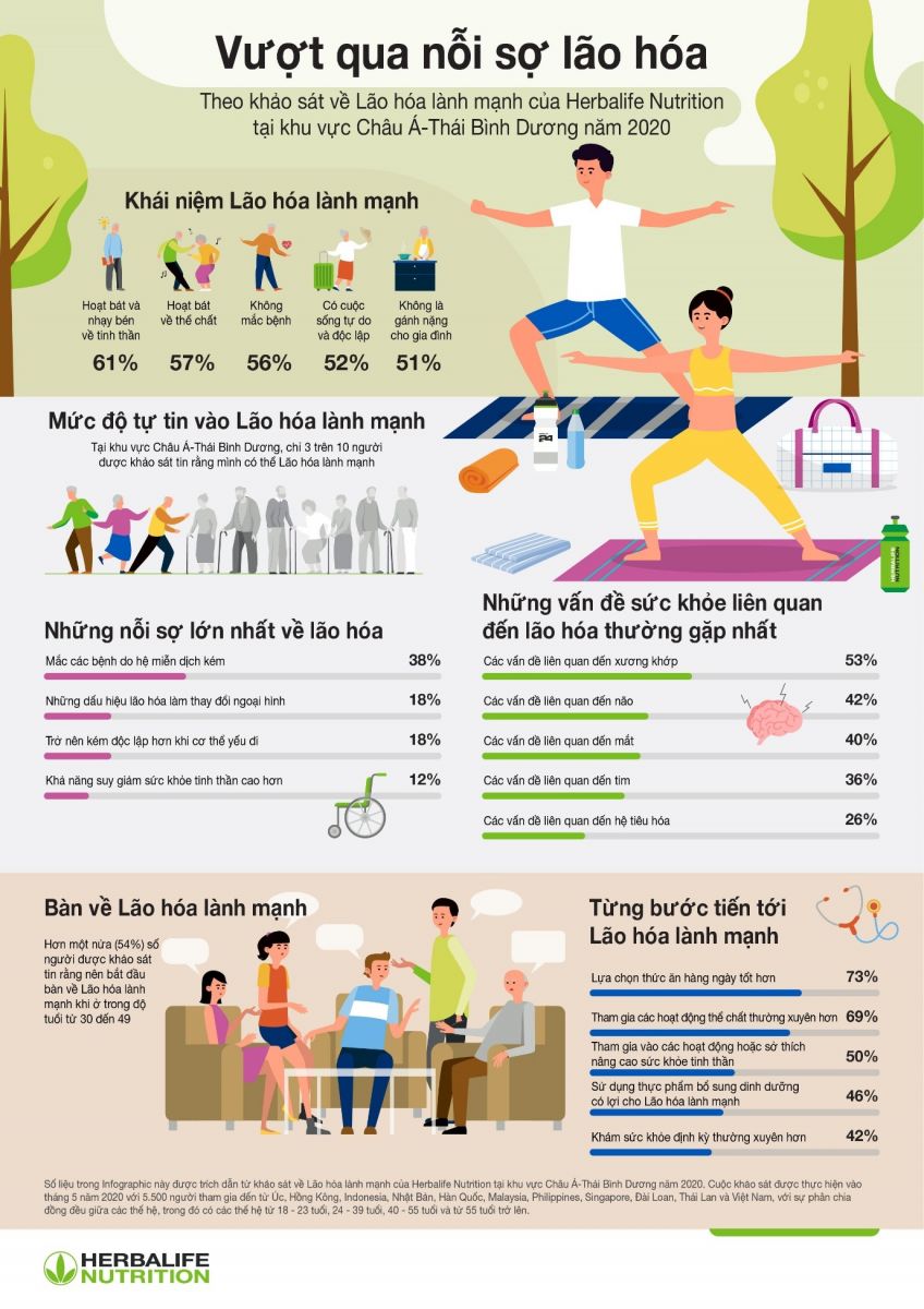 Dựa trên khảo sát của Herbalife Nutrition về tình trạng lão hóa lành mạnh (Healthy Aging) ở châu Á – Thái Bình Dương 2020 tại 11 thị trường bao gồm Australia, Hồng Kông, Indonesia, Nhật Bản, Hàn Quốc, Malaysia, Philippines, Singapore, Đài Loan, Thái Lan và Việt Nam, kết quả đã giúp định nghĩa về lão hóa lành mạnh trở nên hữu hình hơn.