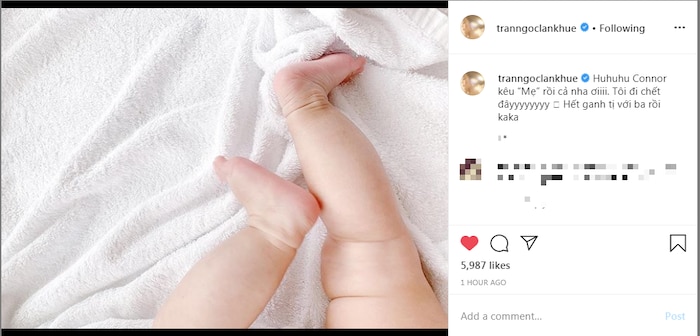 Mới đây, Lan Khuê xúc động chia sẻ niềm hạnh phúc khi con trai đã biết gọi "mẹ". Đăng tải khoảnh khắc nắm tay con trai, nữ siêu mẫu vui mừng thông báo: "Connor kêu “Mẹ” rồi cả nha ơi. Tôi đi chết đây! Hết ganh tị với ba rồi”.