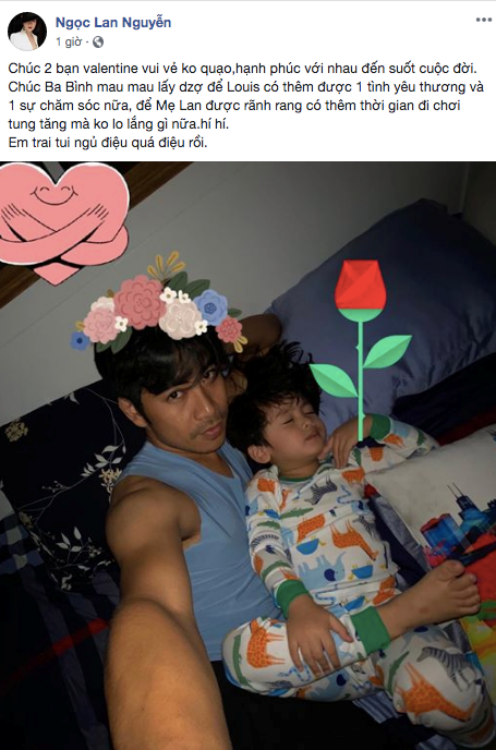 Nhân ngày lễ tình yêu, Ngọc Lan đăng ảnh Thanh Bình chụp cùng con trai trên trang cá nhân. Kèm theo tấm ảnh, nữ diễn viên "Bán chồng" nhắn nhủ tới chồng cũ: “Chúc 2 bạn Valentine vui vẻ không quạo, hạnh phúc với nhau đến suốt cuộc đời. Chúc ba Bình mau mau lấy vợ để Louis có thêm tình yêu thương và một sự chăm sóc nữa, để mẹ Lan được rảnh rang có thêm thời gian đi chơi tung tăng mà không lo lắng gì nữa. Em trai tui ngủ điệu quá điệu rồi".”.