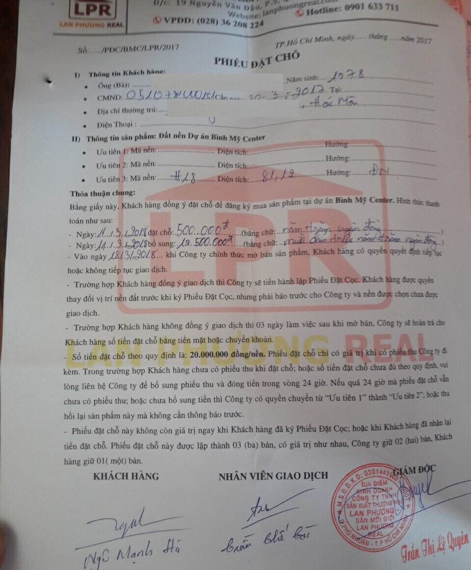 Không những thế, theo hồ sơ mà PV có được, hiện Công ty Lan Phương đã tiến hành thu tiền đặt cọc, giữ chỗ của rất nhiều khách hàng với số tiền là 20 triệu/ nền.