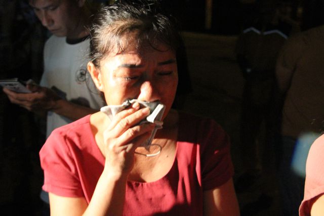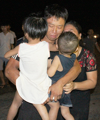 Bà Bùi Thị Liên đưa 2 cháu nhỏ đến tận cảng Cửa Lò để đón con trai là thuyền viên Đinh Trọng Hậu. Chỉ đến khi nhìn thấy con trai bà mới dám tin anh còn sống. Anh Hậu ôm chặt lấy hai con thơ đi bên cạnh người mẹ già đang khóc nức nở trong giây phút đoàn viên.