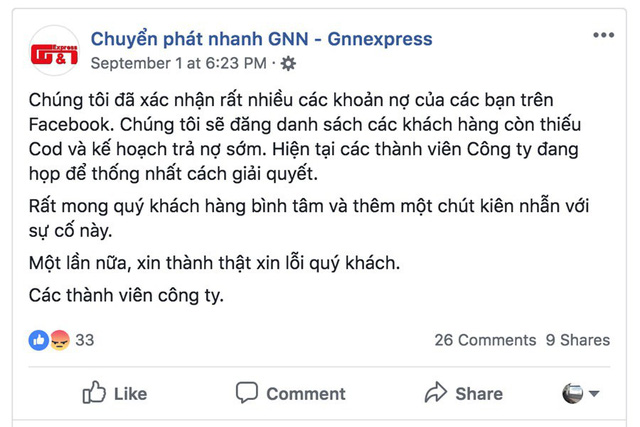 Mới đây, Tổng Giám đốc công ty Cổ phần chuyển phát nhanh G.N.N (GNN Express) - ông Hoàng Ngọc bất ngờ công bố trên Facebook việc doanh nghiệp này phải dừng hoạt động do “không còn đủ khả năng tài chính”.