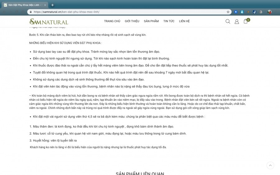 Bên cạnh đó, website Samnatural.vn cũng quảng cáo một số sản phẩm có tác dụng như thuốc chữa bệnh. Cụ thể sản phẩm kén đặt phụ khoa Mộc Linh được quảng cáo như là thuốc: "Trong 3 ngày để viên thuốc trong âm đạo, người bệnh vẫn vệ sinh tắm rửa, đi vệ sinh bình thường, yên tâm là viên thuốc sẽ không bị rơi ra trừ trường hợp âm đạo của người bệnh rộng quá, hoặc sau khi đặt đã vận động đi lại chạy nhẩy ngay. Vì vậy nên đặt thuốc trước khi đi ngủ, hoặc đặt xong thì nằm nghỉ 15 phút hẵng đi lại".
