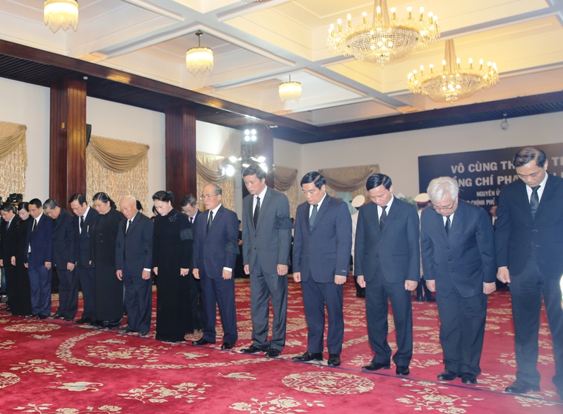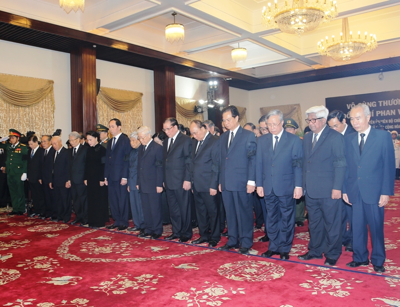 Đoàn đại biểu đầu tiên – Đoàn đại biểu lãnh đạo, nguyên lãnh đạo Đảng và Nhà nước do đồng chí Nguyễn Văn Bình, Ủy viên Bộ Chính trị, Bí thư Trung ương Đảng, Trưởng Ban Kinh tế Trung ương dẫn đầu vào viếng nguyên Thủ tướng Phan Văn Khải.