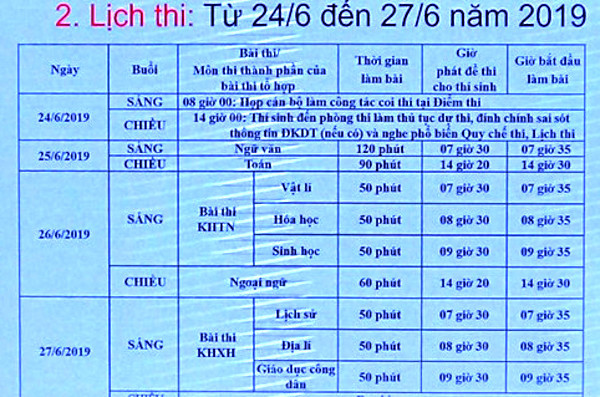 Cụ thể, kỳ thi THPT quốc gia năm 2019 sẽ diễn ra từ ngày 25-27/6. Theo đó, học sinh sẽ làm ba bài thi độc lập gồm Toán, Ngữ Văn, Ngoại ngữ và hai bài thi tổ hợp là Khoa học tự nhiên (tổ hợp các môn Vật Lý, Hóa học, Sinh học) và Khoa học xã hội (gồm các môn Lịch sử, Địa Lý, GDCD).