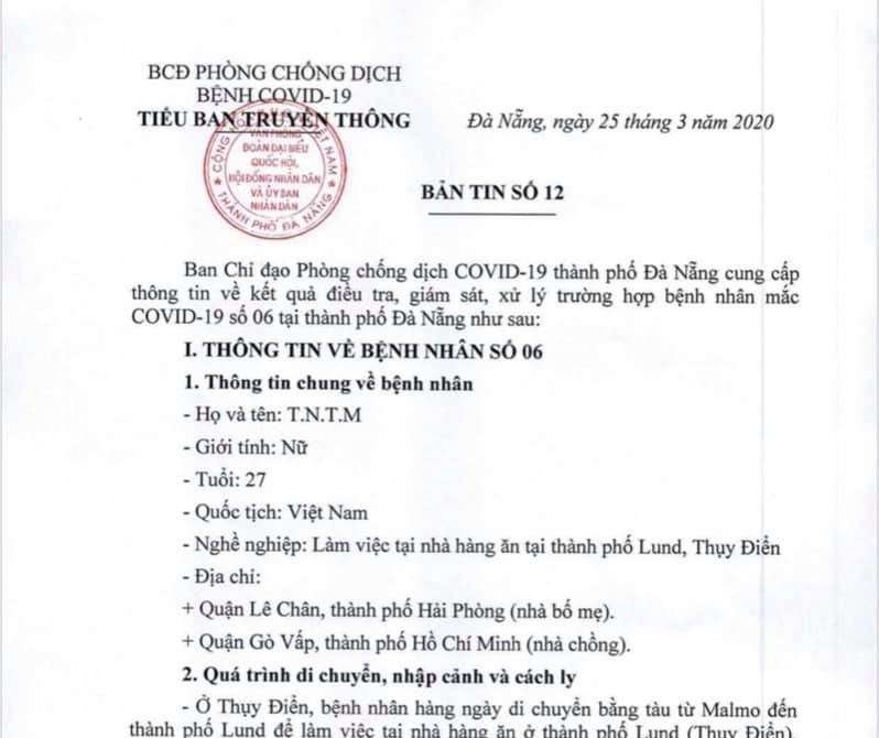 Theo đó, bệnh nhân này là T.N.T.M, giới tính nữ, tuổi đời 27. Bệnh nhân Quốc tịch Việt Nam, làm việc tại Thụy Điển. Quá trình di chuyển, nhập cảnh và cách ly của nữ bệnh nhân này như sau: