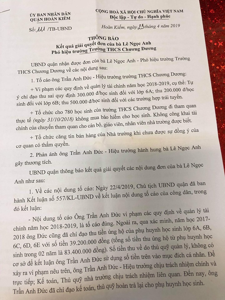 Tại văn bản này cho biết, ngày 22/4, Chủ tịch UBND quận đã ban hành kết luận số 557/KL-UBND về nội dung tố cáo của công dân. Trong đó kết luận, nội dung tố cáo ông Trần Anh Đức vi phạm các quy định về quản lý tài chính năm học 2018-2019 là đúng. Ngoài ra, năm học 2017-2018, ông Đức cũng đã chỉ đạo thu tiền ủng hộ của phụ huynh học sinh. Tổng số tiền thu của hai năm học là 83.400.000 đồng. Số tiền trên do thủ quỹ quản lý, không có cơ sở để kết luận ông Đức sử dụng vào mục đích cá nhân. Để xảy ra sai phạm trên, ông Đức phải chịu trách nhiệm chính và trực tiếp, kế toán thủ quỹ nhà trường chịu trách nhiệm liên quan. Đến nay, ông Đức đã chỉ đạo thủ quỹ, kế toán trả lại tiền cho phụ huynh học sinh.