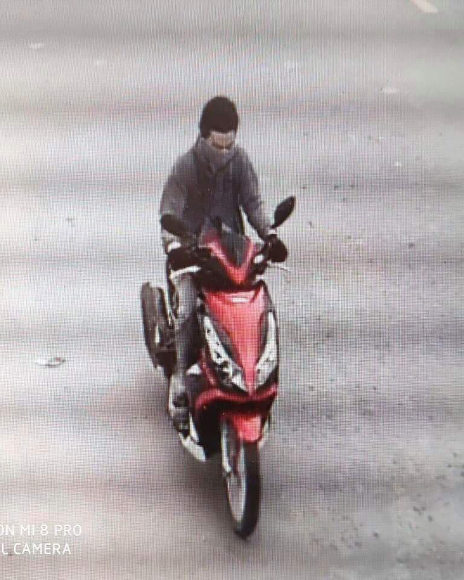 Qua hình ảnh trích xuất từ camera an ninh, nghi phạm đi xe mô tô AirBlade màu đỏ - đen, không biển số, người mặc áo khoác, quần Jean, đội nón bảo hiểm màu đỏ, mang găng tay đen, đeo túi da.