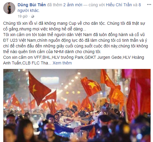 Trên trang cá nhân, chàng cầu thủ xứ Thanh viết: “Chúng tôi xin lỗi vì đã không mang cup về cho dân tộc. Chúng tôi đã thật sự cố gắng, nhưng mọi việc không hề dễ dàng...