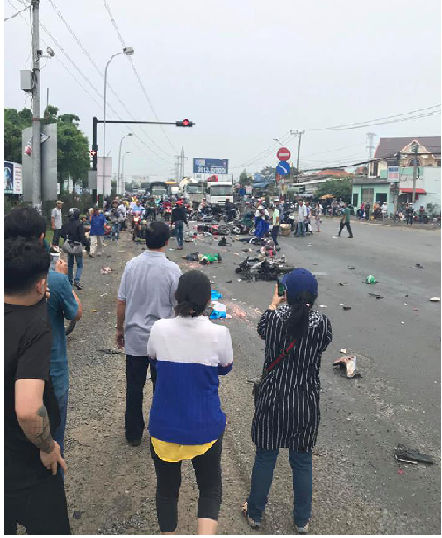 Theo thông tin ban đầu, vào lúc 15h30 ngày 2/1, tại ngã tư Bình Nhật, gần cầu Bến Lức thuộc km 1936 Quốc lộ 1, ấp 3, xã Nhật Chánh, huyện Bến Lức, Long An, một xe container bất ngờ tông hàng loạt xe máy dừng đèn đỏ.