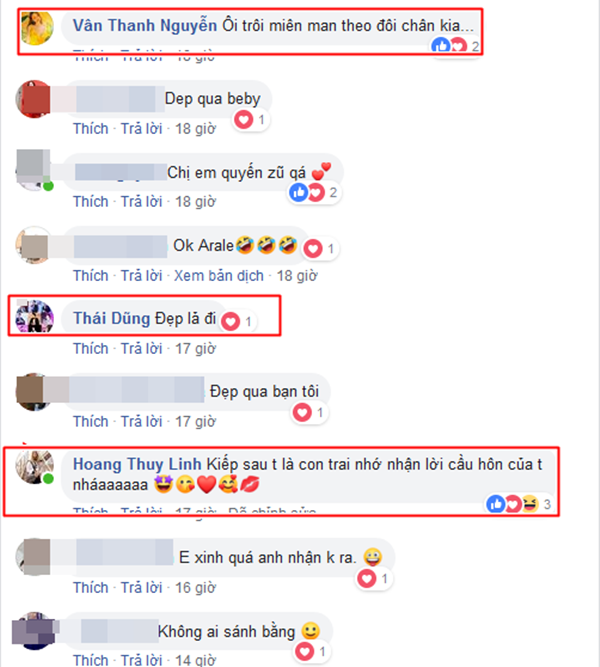 Những bình luận khen ngợi vẻ đẹp của Mai Phương Thúy. Vân Hugo phải "trôi theo đôi chân dài", MC Thái Dũng thì "lả đi". Thậm chí, cô bạn thân của hoa hậu Mai Phương Thúy - Hoàng Thùy Linh phải thốt lên rằng: "Kiếp sau tớ là con trai thì nhớ nhận lời cầu hôn của tớ nhá".
