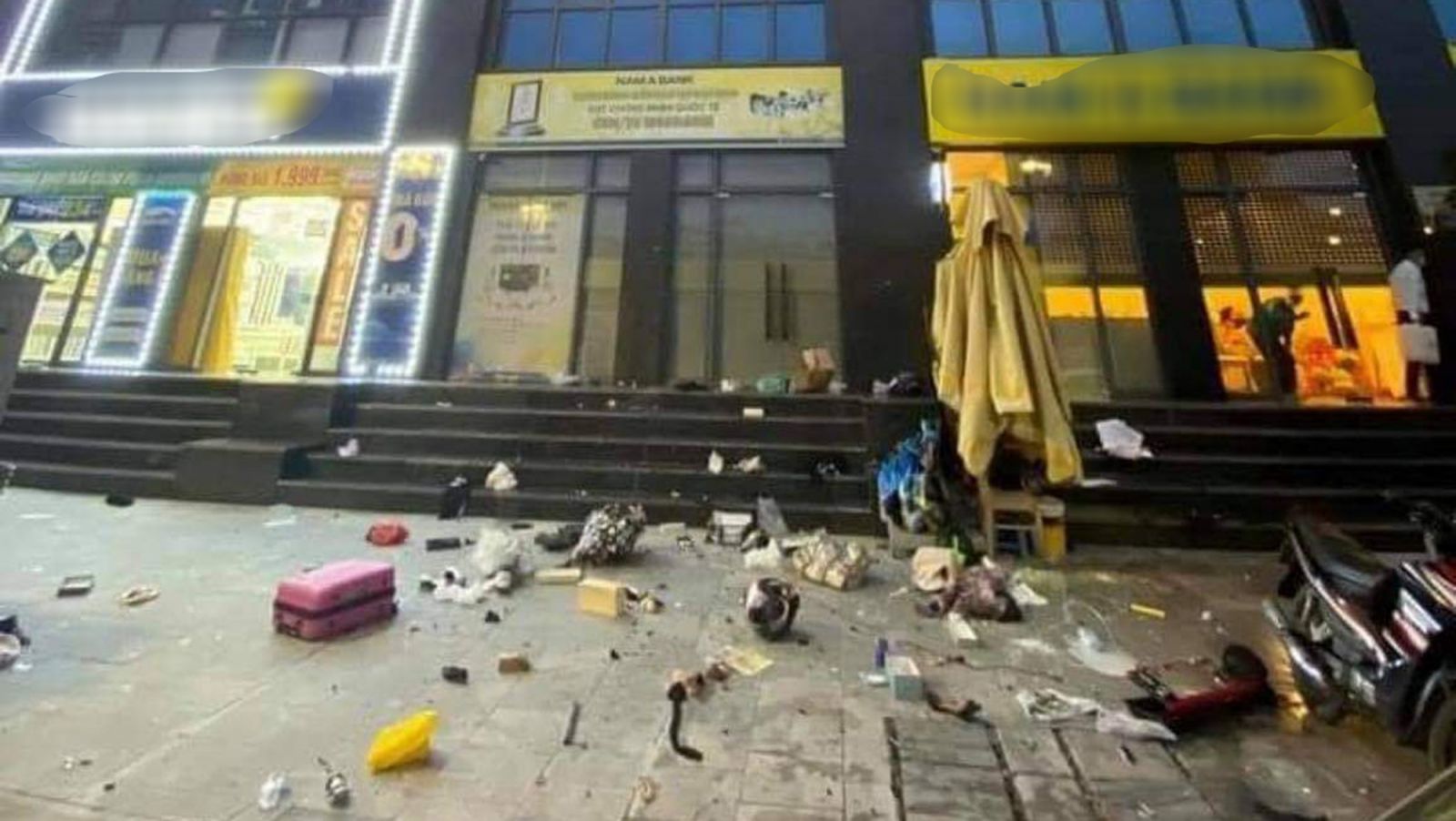 Nhận được tin báo, cơ quan chức năng đã đến hiện trường làm rõ. Tại hiện trường, quần áo, vali, xoong chảo, đồ dùng sinh hoạt....văng tung tóe trên sảnh tòa nhà và vỉa hè.