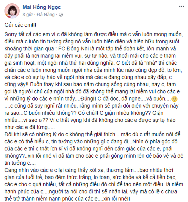 Stt vừa qua là nguồn cơn của mọi vấn đề, trong status có câu "tự cứu lấy chính mình chị nhé!". Chị hãy tự làm tất cả mọi thứ, nghe đau đớn lắm phải không? Nhưng cái mà tụi em đang muốn nói ở đây là "những sản phẩm âm nhạc được sáng tác bởi Đông Nhi", "một kịch bản MV mà Đông Nhi viết", cái mà Đông Nhi ở thời điểm hiện tại cần (có lẽ tụi em đã quá hấp tấp rồi đúng không?). Nhưng đó đâu chỉ mình em nghĩ như thế, có lẽ tụi em đã chờ đợi quá lâu nên vội vàng. Nhưng tất cả những thổ lộ tâm tư đó đâu có một lời nào là buông tay chị, rời bỏ chị mà đi. Tụi em đã ở bên chị gần 10 năm qua, là cả một thời gian dài, rất rất dài đối với những đứa trẻ loi nhoi đến những người trẻ có công việc. Tụi em chưa từng bỏ chị đi, chưa bao giờ có ý định quay lưng với chị cả.”