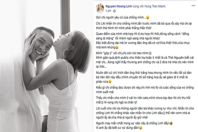Hoàng Linh tâm sự, cô đã giận dữ đến nỗi định công khai danh tính người phụ nữ kia nhưng sau cùng đã nghĩ lại: “Mình ‘góp ý’ với chị, chị còn trả treo mình. Mình giận quá, định công khai cho thiên hạ, hoặc ít nhất là cả Thái Nguyên biết mặt chị. Xong nghĩ thấy thương anh chồng và 2 đứa trẻ nhà chị nên mình lại thôi”, Hoàng Linh chia sẻ. Cũng theo Hoàng Linh, người phụ nữ kia đã nhắn tin nhưng khi cô chưa kịp đọc đã tự thu hồi lại tin nhắn