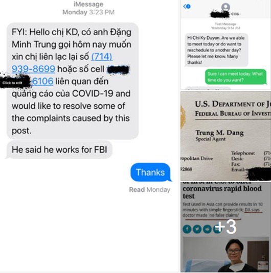 FBI đã gọi đến công ty của tôi để tìm tôi, sau khi nhận được tin nhắn của cô thư ký, tôi lập tức liên lạc FBI và hẹn gặp. FBI gửi hai người đến gặp tôi: Một đặc vụ người Mỹ và một đặc vụ người Mỹ gốc Việt. Họ hỏi tôi rất kỹ về các chi tiết: Cô có làm việc cho M.D (bác sĩ xét nghiệm cho nữ MC) không, loại test kit cô thử là loại gì (igG/igM Rapid Test from Korea), cô thử làm sao, M.D đã nói gì với cô, đã gửi gì cho cô…".