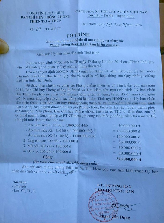 Trước đó, ngày 9/1/2018, ban Chỉ đạo Phòng chống thiên tai và Tìm kiếm cứu nạn tỉnh Thái Bình có Tờ trình số 02/TTr - PCTT do ông Phạm Văn Dụng, Phó Trưởng ban ký gửi Ủy ban Nhân dân tỉnh Thái Bình về việc xin kinh phí mua bộ đồ đi mưa phục vụ công tác Phòng chống thiên tai và Tìm kiếm cứu nạn với tổng số tiền là 396.000.000 đồng.