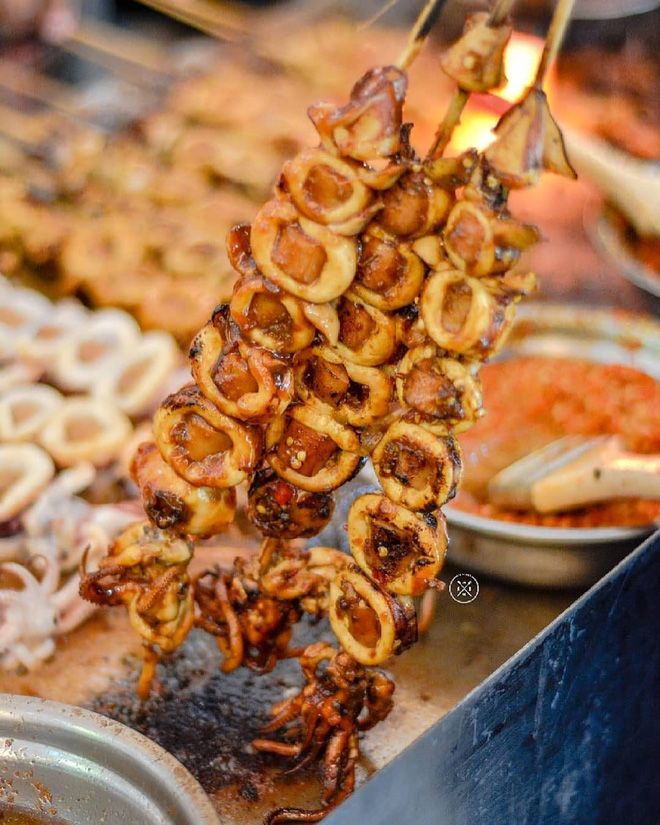 Điểm hấp dẫn của món ăn này chính là bạn sẽ thưởng thức phép cộng của cả hai hương vị "khoái khẩu": mực và các loại chả viên. Xiên mực trông xinh xắn nhưng đầy quyến rũ chỉ cần nhìn thôi cũng "ứa nước miếng". Càng nhai bạn sẽ cảm nhận được vị ngọt tươi kết hợp với các khoanh xúc xích dai dai hay chả cá giòn sật. Đặc biệt là phần sốt ướm đều mang đến vị cay the nồng nàn đầy kích thích.