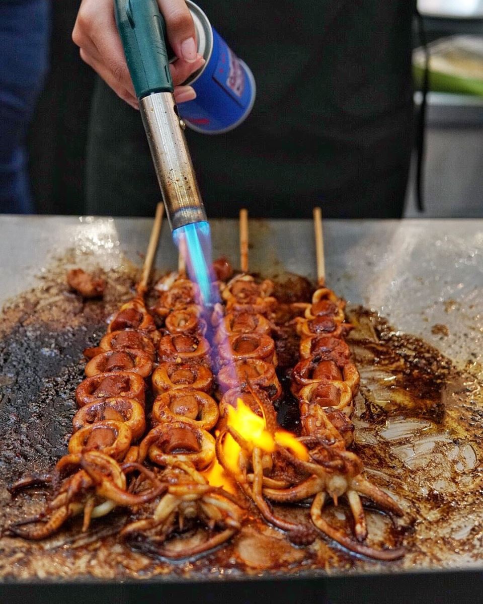 Cách nướng của món ăn này cũng đặc biệt hơn hẳn. Người ta dùng lửa thật to bên trên để làm chín món, phải liên tục quết thêm tương cho thấm vị từ từ. Trong làn khói nghi ngút bốc lên, xiên mực vừa dậy lên mùi thơm lừng chuyển hẳn sang màu nâu đen bắt mắt.