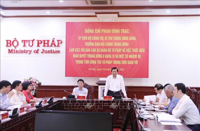 Về phương hướng, nhiệm vụ thời gian tới để tiếp tục thực hiện Nghị quyết Trung ương 8, Trưởng ban Nội chính Trung ương Phan Đình Trạc đề nghị, Bộ, ngành Tư pháp tiếp tục nâng cao hơn nữa hiệu quả công tác tham mưu xây dựng chính sách pháp luật và thi hành pháp luật, đảm bảo xây dựng hệ thống pháp luật dân chủ, công bằng, đầy đủ, kịp thời, đồng bộ, thống nhất, ổn định, khả thi, dễ tiếp cận và đủ khả năng điều chỉnh các quan hệ xã hội, đảm bảo thi hành pháp luật nghiêm minh, công bằng và hiệu quả.