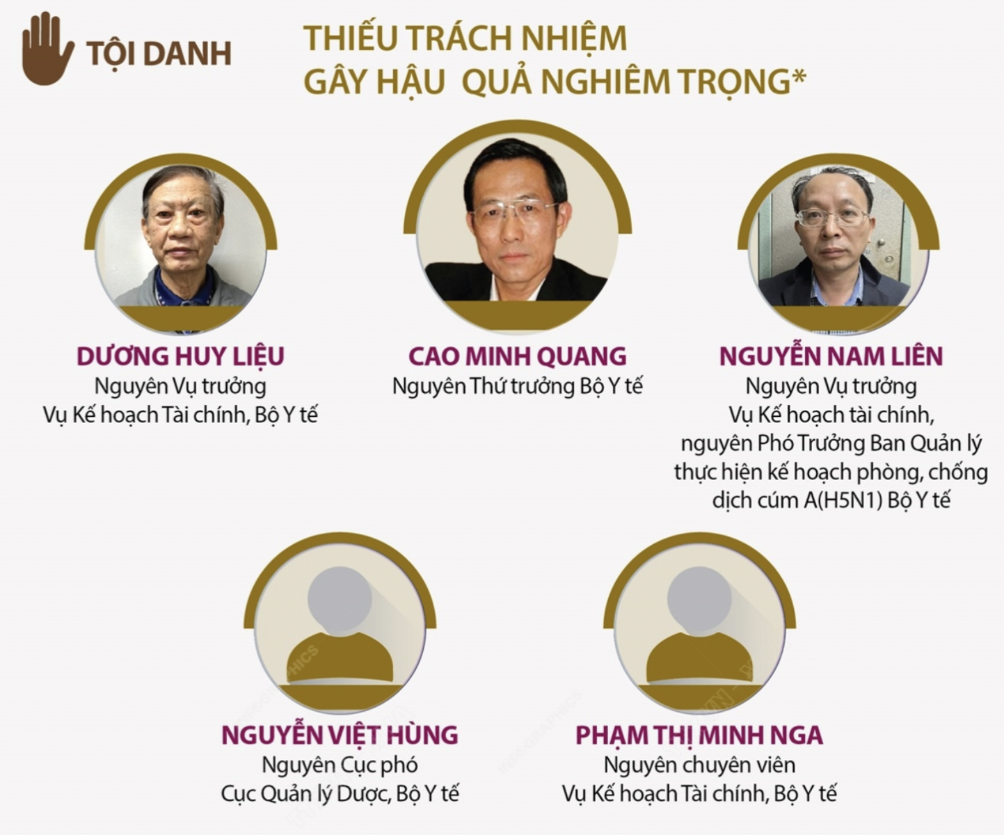 Trong số 9 bị cáo bị đưa ra xét xử trong vụ án này, có tới 5 bị cáo nguyên là cán bộ, lãnh đạo của Bộ Y tế, gồm: Cao Minh Quang (sinh năm 1956, nguyên Thứ trưởng Bộ Y tế), Dương Huy Liệu (sinh năm 1948, nguyên Vụ trưởng Vụ Kế hoạch Tài chính Bộ Y tế), Nguyễn Nam Liên (sinh năm 1970, nguyên Phó Vụ trưởng Vụ Kế hoạch Tài chính Bộ Y tế, Phó Trưởng ban quản lý thực hiện kế hoạch phòng, chống dịch cúm A (H5N1) Bộ Y tế), Phạm Thị Minh Nga (sinh năm 1972, chuyên viên Vụ Kế hoạch Tài chính Bộ Y tế, nguyên Kế toán trưởng Ban quản lý thực hiện kế hoạch phòng, chống dịch cúm A (H5N1) Bộ Y tế), Nguyễn Việt Hùng (sinh năm 1956, nguyên Phó Cục trưởng Cục Quản lý Dược, Bộ Y tế) bị Viện Kiểm sát nhân dân Tối cao truy tố về tội "Thiếu trách nhiệm gây hậu quả nghiêm trọng" theo quy định tại Điều 285, khoản 2 - Bộ luật Hình sự năm 1999.
