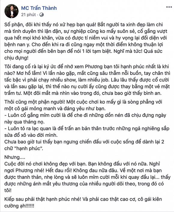 Trấn Thành cũng có đôi lời gửi tới diễn viên Mai Phương: “Bắt người ta xinh đẹp làm chi mà tình duyên thì lận đận, sự nghiệp cũng không mấy suôn sẻ, cố gắng vượt qua hết mọi khó khăn, vừa có được niềm vui và hy vọng lại đối diện với bệnh nan y. Cho đến khi ra đi cũng ngay một thời điểm không thuận lợi cho mọi người đến bên bạn để nói 1 lời tạm biệt. Quá sức chịu đựng! Tôi đang cố rà lại ký ức để nhớ xem Phương – bạn tôi hạnh phúc nhất là khi nào? Mơ hồ lắm!”.