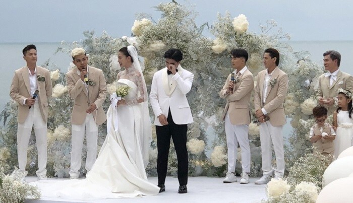 Nữ diễn viên nói chỉ cần ông xã đưa khăn khi cô khóc, nhắc cô nên dành nhiều thời gian cho bản thân hơn công việc, vậy đã đủ. "Đả nữ" cũng hứa làm một người vợ tốt và sẵn sàng có những đứa con. Những chia sẻ của cô dâu, chú rể khiến khách mời có mặt cũng không khỏi xúc động.