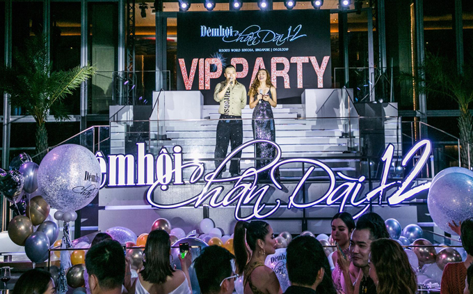 Bộ váy ánh kim được phối cùng tông với giày cao gót, giúp người đẹp nổi bật dưới ánh đèn. Ngọc Trinh tiếp tục đồng hành với ông bầu Vũ Khắc Tiệp trong Đêm hội chân dài 12.