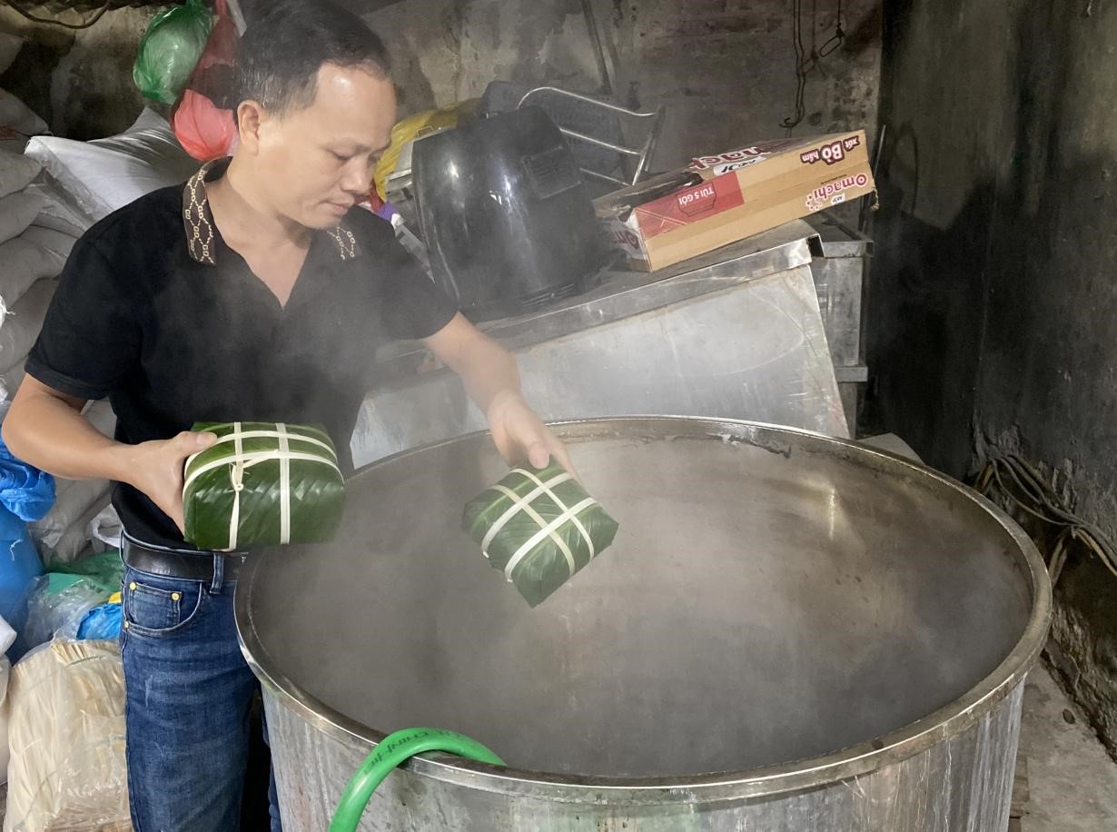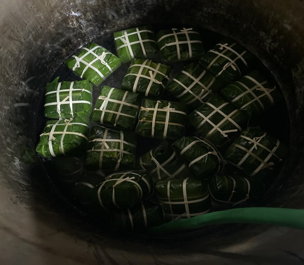 Những chiếc bánh làm ra nhanh chóng được xếp vào nồi. Công đoạn luộc bánh này giờ đây có sự giúp sức nhiều của công nghệ hiện đại nên đã bớt nhọc nhằn hơn trước. Chị Trần Linh Anh (40 tuổi) nhớ lại: “Trước đây, tất cả mọi nhà đều sử dụng bếp củi và chủ yếu là bếp than. Tuy nhiên, bếp than rất độc hại, về lâu dài ảnh hưởng không tốt tới sức khỏe nên mấy năm trở lại đây, phần lớn các hộ đều chuyển sang luộc bánh bằng bếp điện nên đỡ vất vả hơn rất nhiều”. Anh Nguyễn Văn Phong vừa làm vừa giới thiệu cho chúng tôi chiếc bếp điện mà gia đình đã đầu tư: “Bếp điện đầu tư hết nhiều tiền hơn, phải dùng điện 3 pha, nhưng không phải tốn công trông bếp nhiều như bếp than hay bếp củi, chỉ cần cài đặt giờ và chú ý pha nước luộc bánh. Nước cũng có vòi bơm trực tiếp vào nồi”. Tưởng chừng đơn giản nhưng công đoạn thêm nước vào nồi cũng có bí quyết riêng, chị Linh Anh chia sẻ, ngày xưa khi luộc bánh, các bà các mẹ hay đặt ấm nước để bên cạnh bếp, khi nào nước sôi thì đổ vào nồi, nhưng theo chị, làm như vậy bánh không được dền, nên nước khi thêm vào phải là nước lạnh.