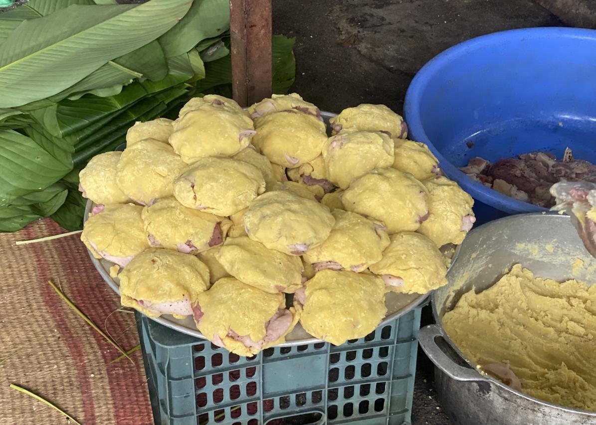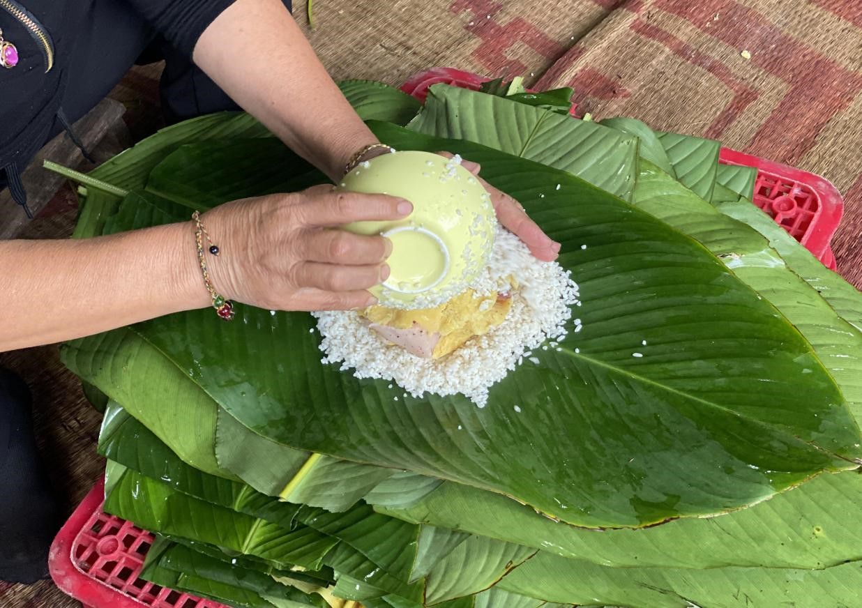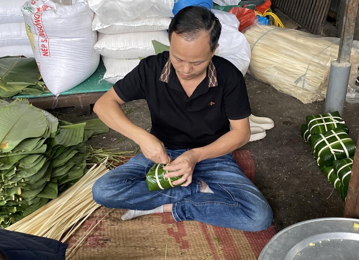 Trước khi bước vào công đoạn làm bánh, mọi nguyên liệu phải được xếp sẵn. Đỗ xanh sau khi ngâm được mang đi đồ chín, đánh nhuyễn. Thịt rửa sạch, cắt miếng cỡ vừa, trộn lẫn với hạt tiêu xay và gia vị, sau đó viên lại thành từng nắm to làm nhân bánh. Tuy nhiên, đõ xanh không được bọc kín thịt mà phải luôn để hở để khi nấu, mỡ chảy ra thấm vào lớp gạo. Lá dong tước bỏ gân cứng, gập và xếp ngay ngắn, mỗi bánh được gói gọn trong sáu chiếc lá. Nhiều gia đình cầu kỳ hơn, muốn chiếc bánh sau khi thành phẩm màu phải xanh thì có thêm một công đoạn trộn nước lá riềng vào gạo rồi gói. Cứ như vậy, mỗi người phụ trách một công đoạn riêng, người trộn gạo, người làm nhân bánh, người xếp lá.
