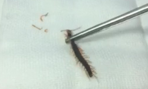 Bác sĩ Trần Vĩnh Khanh cho biết khi kiểm tra, phát hiện một con rết nằm sâu trong tai bé. "May mắn con rết nằm yên, không quậy phá nên cháu bé chỉ ngứa và hơi đau, nếu không thì có thể bị tổn thương thủng màng nhĩ", bác sĩ Khanh chia sẻ.