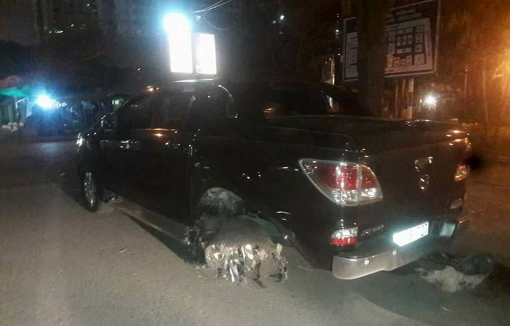 Theo người dân, sau khi bị kéo lê đoạn đường dài xe máy biến dạng khủng khiếp, còn ô tô bị nổ lốp sau.