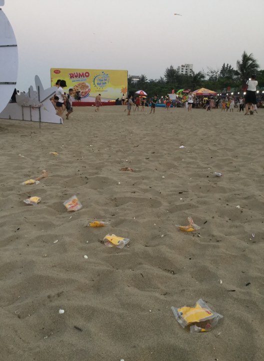 Hàng ngàn vỏ túi ni lông chất thải rắn gói “bánh trứng chà bông” có tên gọi “RUMO” của nhà sản xuất Richy (Công ty TNHH Thương mại và sản xuất Hoàng Mai, có địa chỉ tại Tầng 15, Tòa nhà RICHY, 35 Mạc Thái Tổ, Yên Hòa, Cầu Giấy, Hà Nội) đã được các nhân viên thị trường doanh nghiệp này hồn nhiên tung ra bãi biển Cửa Lò trong ngày 28, 29/4 và dự kiến cả ngày 30/4/2019. Chiêu thức “bôi bẩn” bãi biển Cửa Lò của nhà sản xuất này là: Xin phép thị xã Cửa Lò cho quảng cáo, tiếp thị sản phẩm bánh RUMO trực tiếp bằng việc tổ chức sân khấu giới thiệu ngay trên bãi biển. Cùng với các màn tiếp thị quen thuộc, Công ty này đã phát tặng cho tất cả các du khách có mặt tại bãi biển.