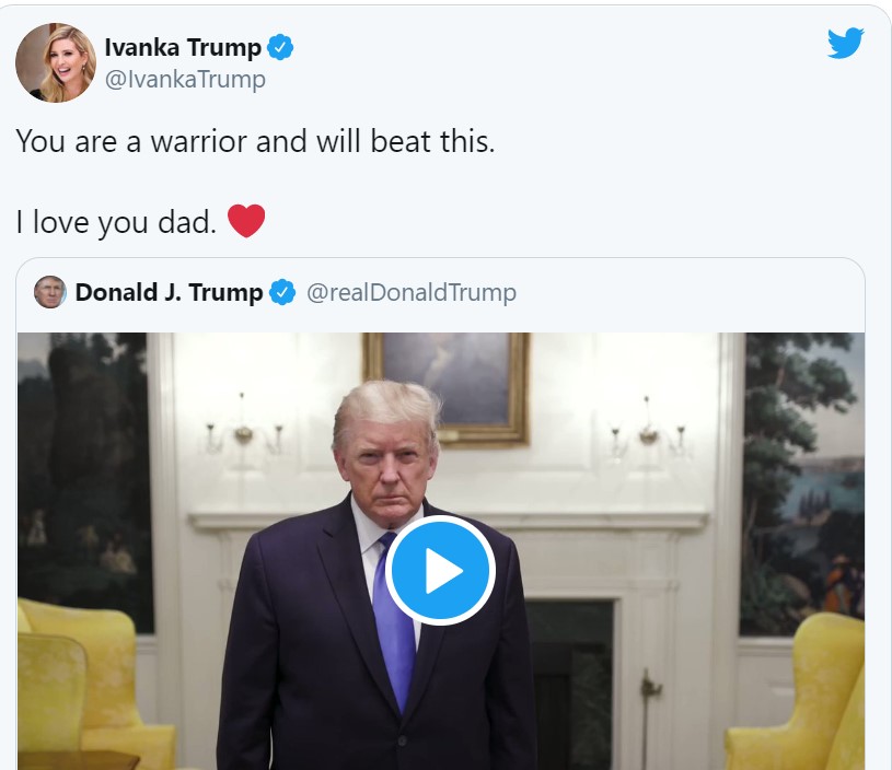 Trong khi đó, "ái nữ" Ivanka Trump cũng dành những lời tương tự em trai mình khi chia sẻ lại đoạn video của tổng thống Mỹ tối 3/10, cô viết: "Cha là một chiến binh và cha sẽ đánh bại căn bệnh này. Con yêu cha".