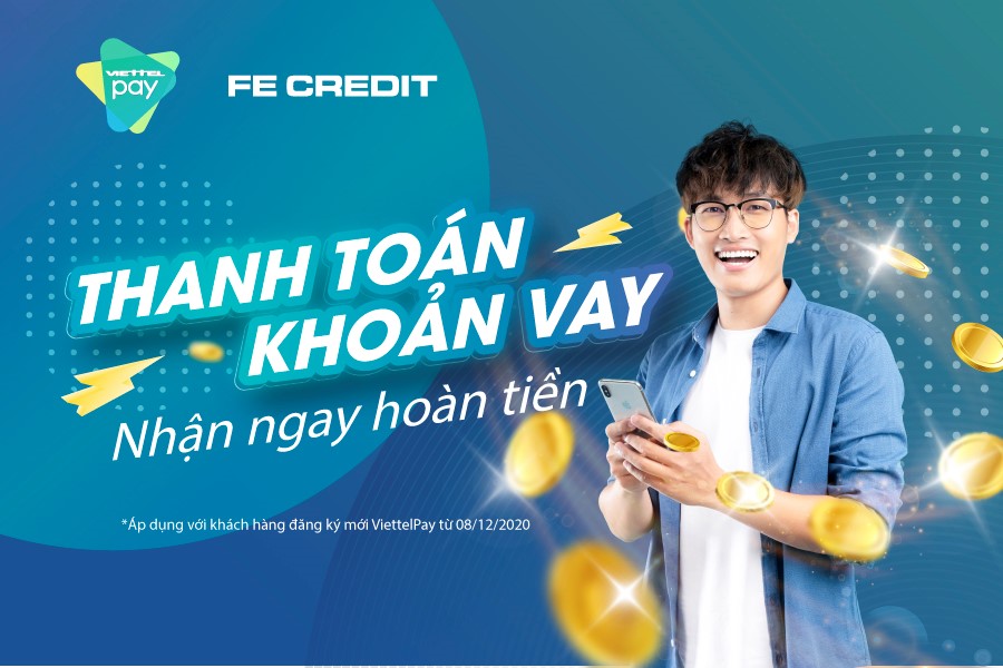 Cụ thể, từ nay đến hết 30/06/2021, khách hàng FE CREDIT khi thanh toán vay tiêu dùng từ 20.000đ qua ứng dụng ViettelPay sẽ được hoàn tiền ngay 6.666đ vào Ví. Chương trình ưu đãi áp dụng cho khách hàng đăng ký mới tài khoản ViettelPay (từ ngày 08/12/2020) hoặc nhận được tin nhắn giới thiệu chương trình từ ViettelPay.