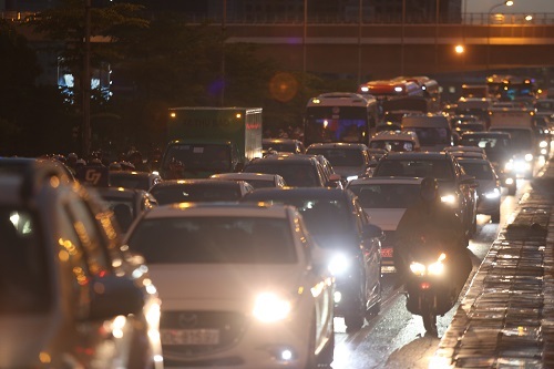 Đến hơn 17h mưa ngớt dần, nước ngập rút nhanh nhưng vào giờ cao điểm nên nhiều tuyến phố ùn tắc kéo dài. Trên đường Tố Hữu, Lê Văn Lương, dòng phương tiện tràn vào làn đường dành riêng cho xe buýt nhanh (BRT) song không thoát khỏi tắc nghẽn.