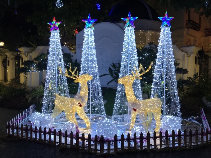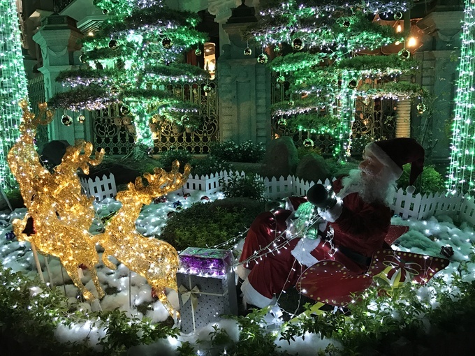 Ngoài những cây đèn màu, gia đình còn đầu tư một cụm tiểu cảnh với ông già Noel cưỡi tuần lộc.