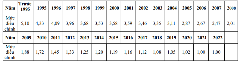 Mức điều chỉnh tiền lương đã đóng BHXH của năm tương ứng được thực hiện theo bảng sau: