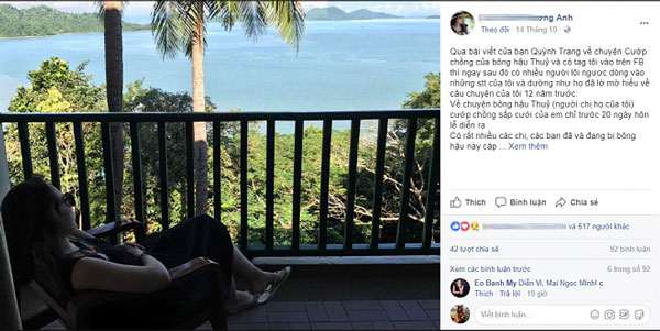 Quỳnh Trang đã viết trên trang cá nhân: "Người tình của chồng tôi, cô Hoa hậu Thu Thuỷ, không chỉ ngang nhiên ăn nằm với chồng tôi, rồi sau đó post Facebook khoe kín đáo, còn nhắn tin doạ dẫm hành hạ tôi, viết email nhục mạ tôi, cũng không quên nói sẽ cưới và đẻ con cho chồng tôi..."