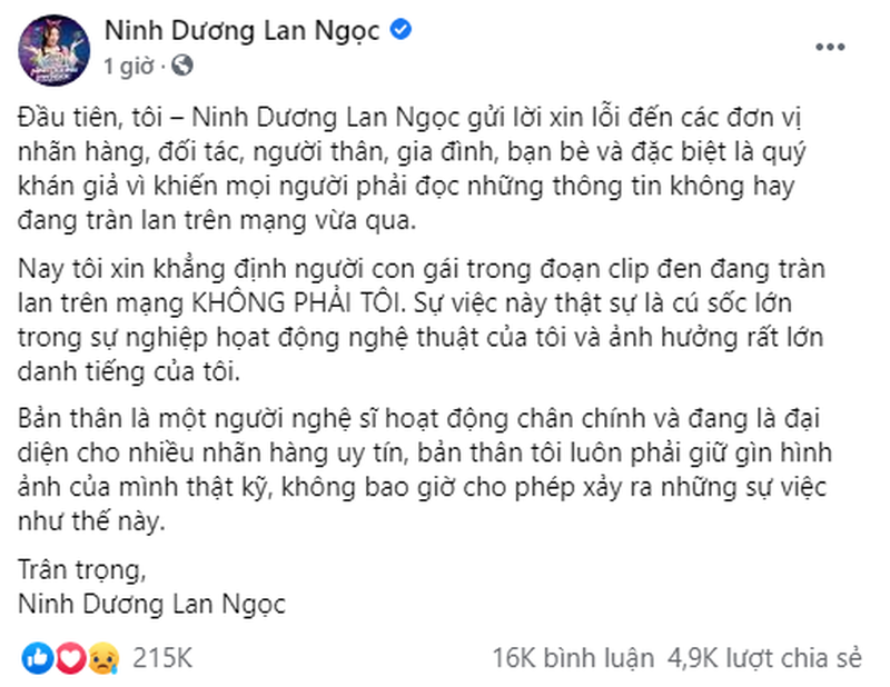 Nay tôi xin khẳng định người con gái trong đoạn clip đen đang tràn lan trên mạng KHÔNG PHẢI TÔI. Sự việc này thật sự là cú sốc lớn trong sự nghiệp họat động nghệ thuật của tôi và ảnh hưởng lớn rất danh tiếng của tôi.