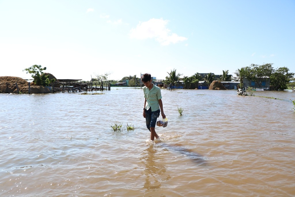 “Nước ở đây đã ngập từ 3 ngày nay, ba mẹ em bị kẹt trong nhà không thể đi được, em phải đi mua đồ ăn sáng mang vào cho ba mẹ. Nước lớn quá em phải để xe đạp ngoài đi đường đi bộ vào”, em Phi người dân tại địa bàn cho biết.
