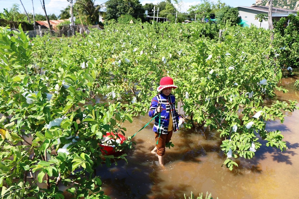 Tại các khu phố 6 và 10, phường Văn Hải, nhiều diện tích nho, táo, ổi của bà con nông dân đang “dầm mình” dưới biển nước. Một số vườn đã xuất hiện tình trạng vàng lá, cây nho bị héo úa.