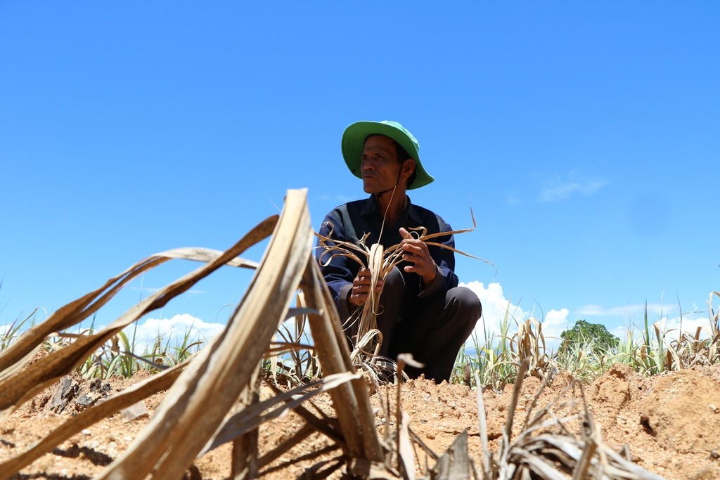 Cách ruộng mía của ông Phùng khoảng 300m là cánh đồng mía 4ha của gia đình ông Lê Văn Ẩn (ngụ thôn Triệu Phong 1). Mặc dù, ruộng mía của ông Ẩn chỉ cách kênh N7 chưa đến 4m, nhưng ruộng mía này cũng bị khô cháy, thân mía bị ngã rạp, diện tích mía chết khô ngày càng lan rộng.