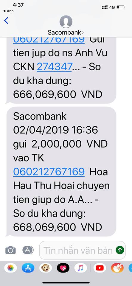 Tính đến 17h chiều cùng ngày, thông qua số tài khoản của NSND Hồng Vân, mọi người đã gửi về số tiền gần 668 triệu đồng. Bà bầu sân khấu kịch cho biết: “Điện thọai của tôi từ trưa tới giờ phải sạc pin liên tục vì nhận tin nhắn chuyển khoản từ mọi người đến để giúp đỡ Anh Vũ. Thay mặt gia đình Anh Vũ, cảm ơn tấm lòng của bạn bè đồng nghiệp và quý khán giả gần xa”.