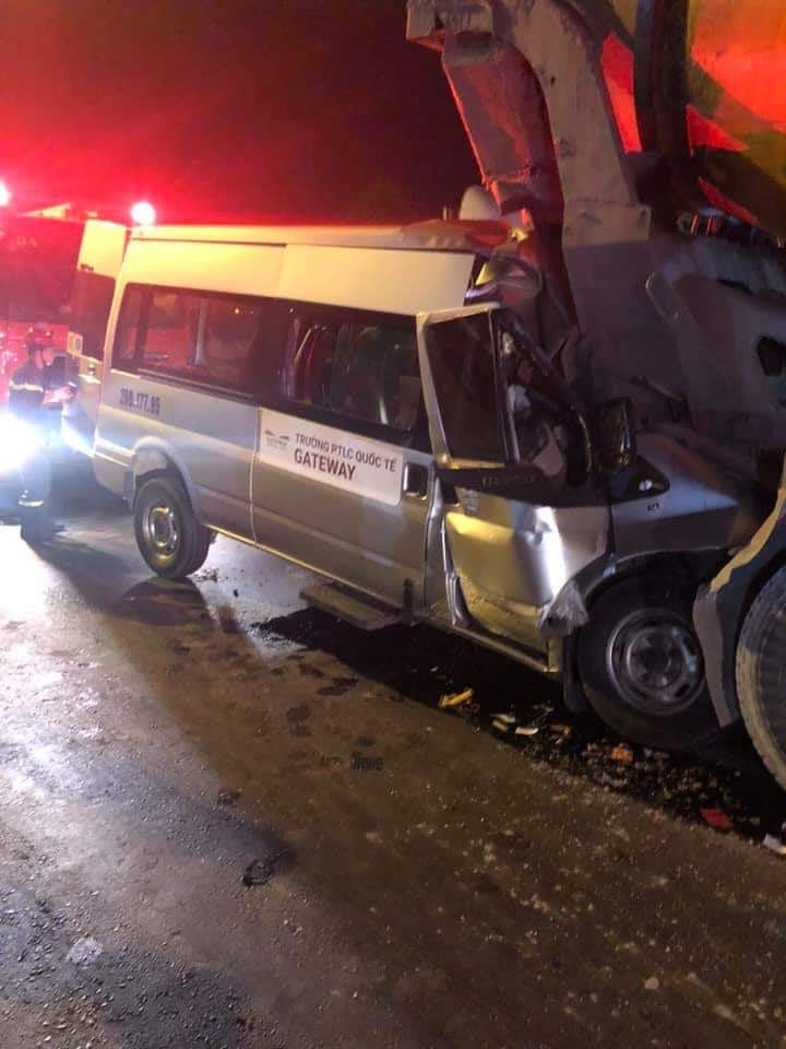 Vào thời điểm trên, xe bồn trộn bê tông đang dừng đèn đỏ trên quốc lộ 5 kéo dài (thuộc địa bàn huyện Đông Anh) thì bất ngờ chiếc xe 16 chỗ dán logo trường phổ thông liên cấp quốc tế Gateway lưu thông cùng chiều đâm vào đuôi xe.