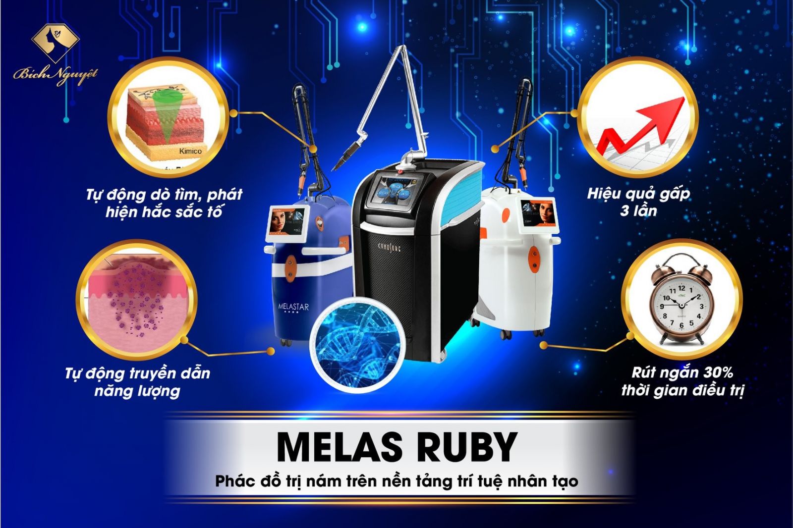 Khi tham dự chương trình Hội thảo do Thẩm mỹ Bích Nguyệt tổ chức, khách hàng có cơ hội được chứng kiến “cú hích” lịch sử khi ứng dụng trí tuệ nhân tạo AI vào quy trình điều trị. Đây là thành quả trong suốt 15 năm nghiên cứu, thử nghiệm của đội ngũ chuyên gia – bác sĩ tại Bích Nguyệt hợp tác cùng các chuyên gia hàng đầu thế giới. Melas Ruby là công trình điều trị nám da vừa đảm bảo tính khoa học, hiệu quả và vừa phù hợp với làn da phụ nữ Việt Nam.
