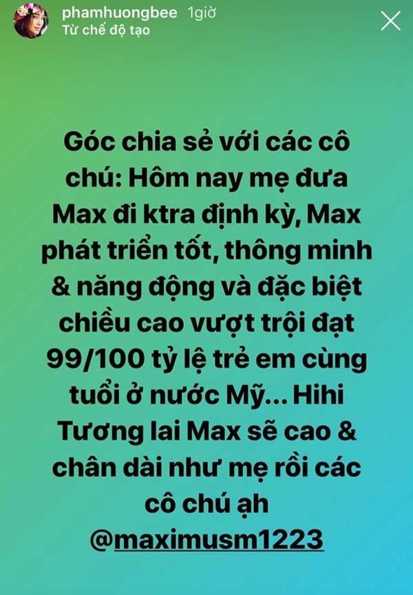 Bên cạnh đó, Phạm Hương cũng tiết lộ thêm về tình hình sức khỏe của con trai. Cậu bé hiện được 13 tháng tuổi, phát triển bình thường, thông minh và năng động. Đặc biệt chiều cao của Maximus vượt trội, đạt 99/100 tỷ lệ trẻ em cùng tuổi ở Mỹ. Nàng hậu cho rằng tương lai con trai cũng sẽ có đôi chân dài như mẹ.