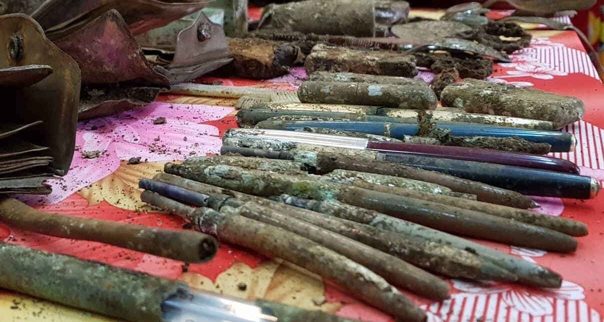 Khi đào sâu xuống đất, lực lượng chức năng phát hiện nhiều mẩu xương cốt, răng và di vật như: Dép râu, võng, bạt, bình nước, dụng cụ y tế, ví da, ảnh,…