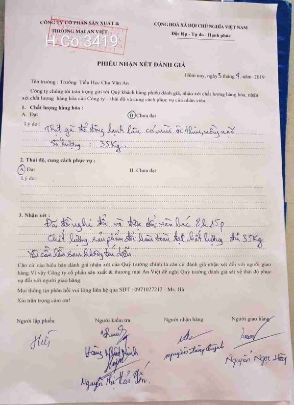 Theo phiếu nhận xét, đánh giá của đoàn kiểm tra thực phẩm Trường Tiểu học Chu Văn An, quận Hoàng Mai, Hà Nội ngày 3/4, 35 kg thịt gà đông lạnh để lâu, có mùi ôi thiu, nồng nặc được đem đến cung cấp cho bếp ăn bán trú tại trường. Phiếu nhận xét có chữ ký của cả đại diện đơn vị cung cấp thực phẩm, nhà trường và phụ huynh học sinh.